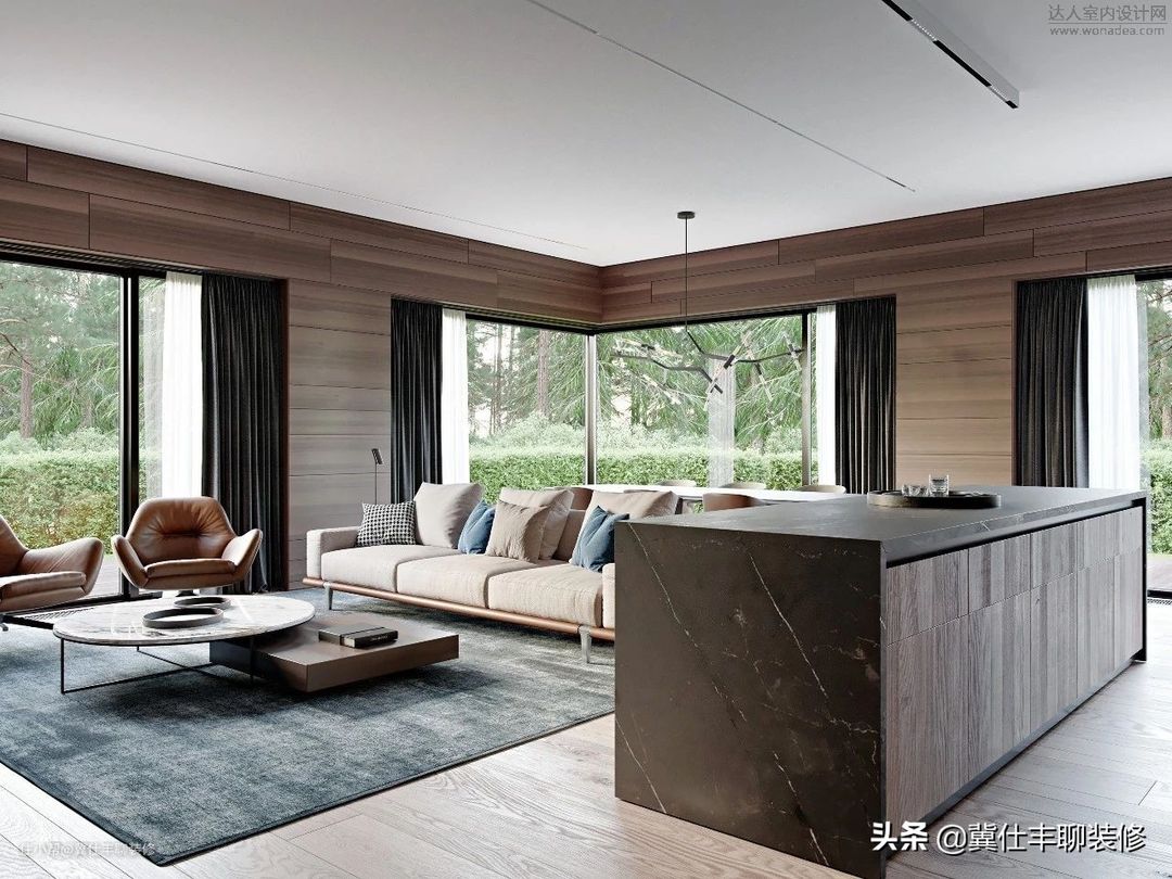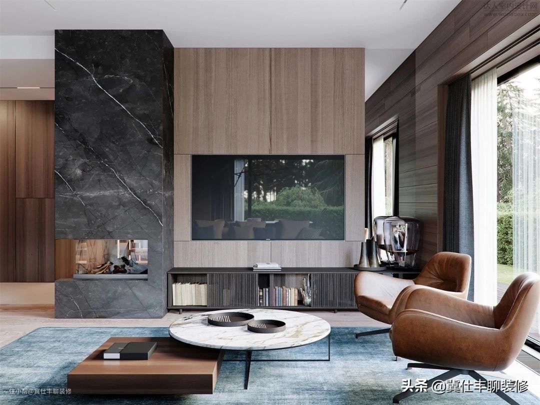胡桃木色饰面板+深灰色岩板,这样的组合在现代风格中屡见不鲜,两种材质的纹理感和颜色搭配在一起,简单又能够体现出高级感。