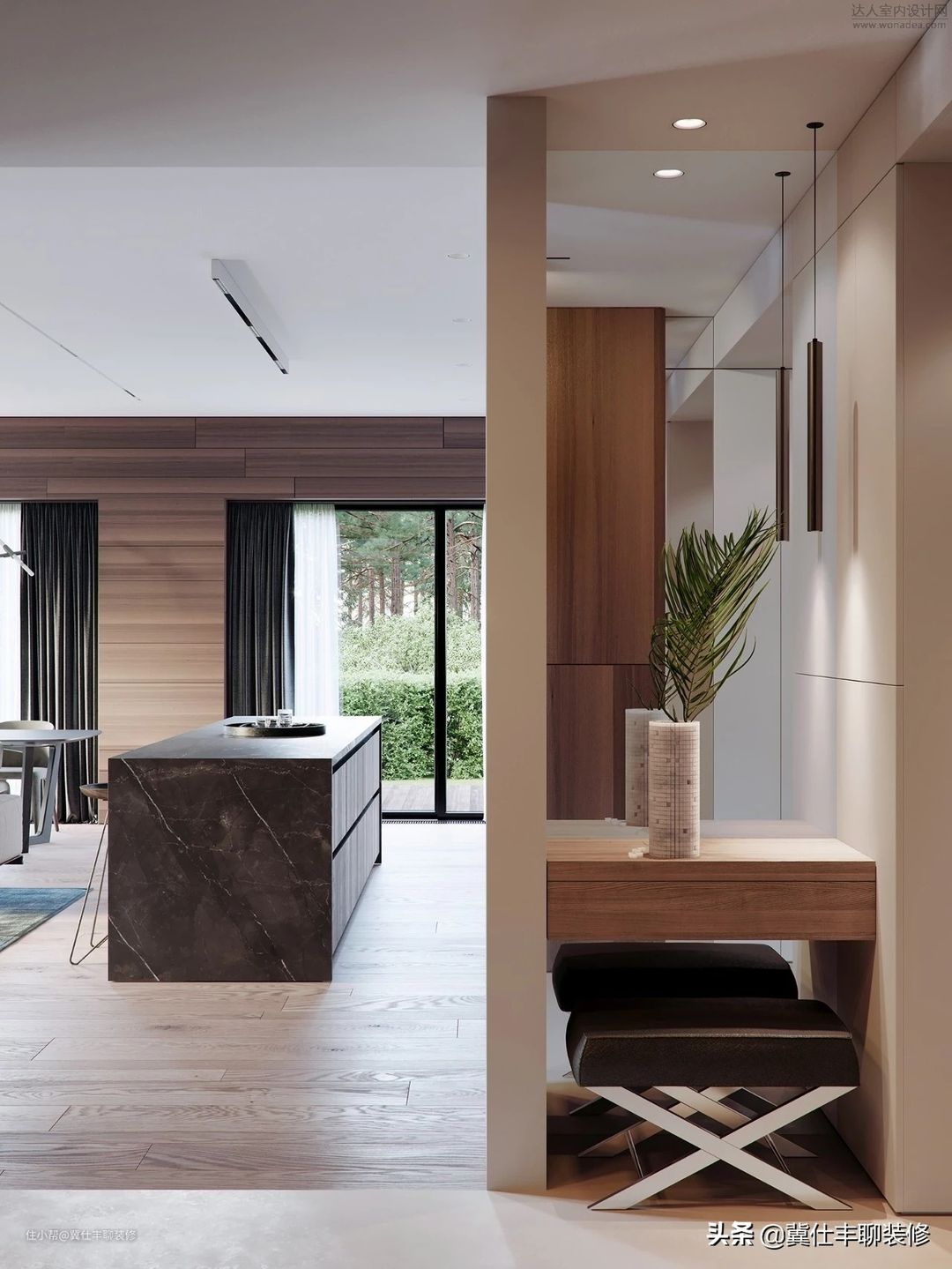 复式住宅,胡桃木色饰面板+深灰色岩板,简单又有高级感