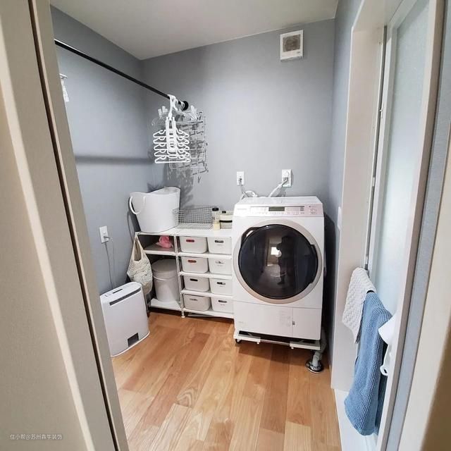 在卫生间干区放置洗衣机、烘干机、晾衣杆、折叠架等,打造小型的家务区。把家务动线减少,尽量在这里完成洗衣、烘干衣服、叠衣服等家务动作。