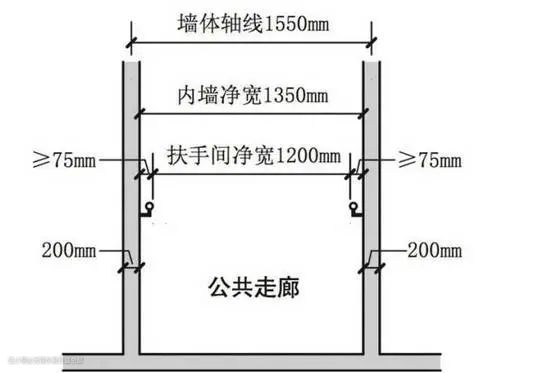 考虑到反向行进和偏瘫患者只能有一侧肢体用力的情况,宜在楼梯间、公共走廊左右两侧均设置扶手。扶手会占据通道净宽,设计时应留出扶手的安装尺寸。