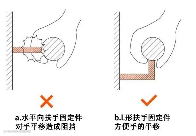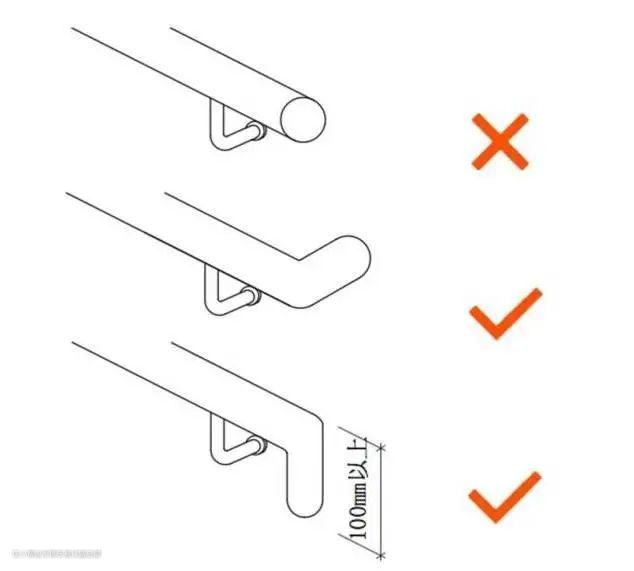 扶手端部应采取向墙壁或下方弯曲的设计,以防止老人使用时衣袖或提包带被勾住而挂倒。