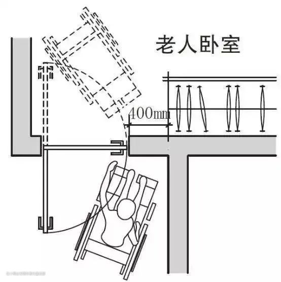 轮椅老人使用平开门时,轮椅脚踏板会占用一定空间,所以应在门扇开启侧留出不小于400mm的墙垛,使乘坐轮椅的老人能够侧向接近门把手,完成开关门的动作。