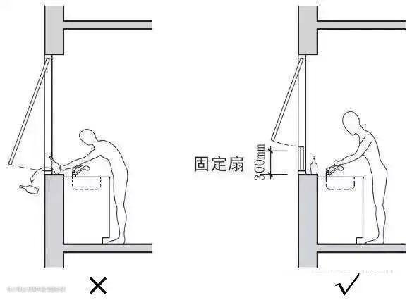 厨房窗下部可留有300mm高的固定扇,以放置一些洗涤剂之类的小物品,并可防止开窗时不慎将物品碰落到楼下误伤他人。