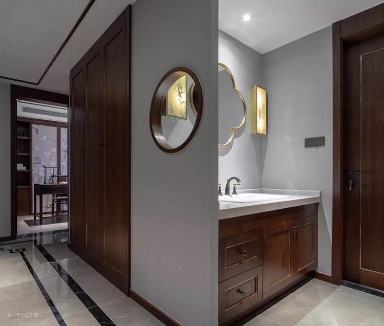 卫生间做了洗手台外移的干湿分离设计,墙面以梅花造型的浴室镜+中式韵味的壁灯,同时墙面又做了圆形的镂空设计,使得空间能够达到互通的效果