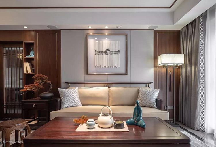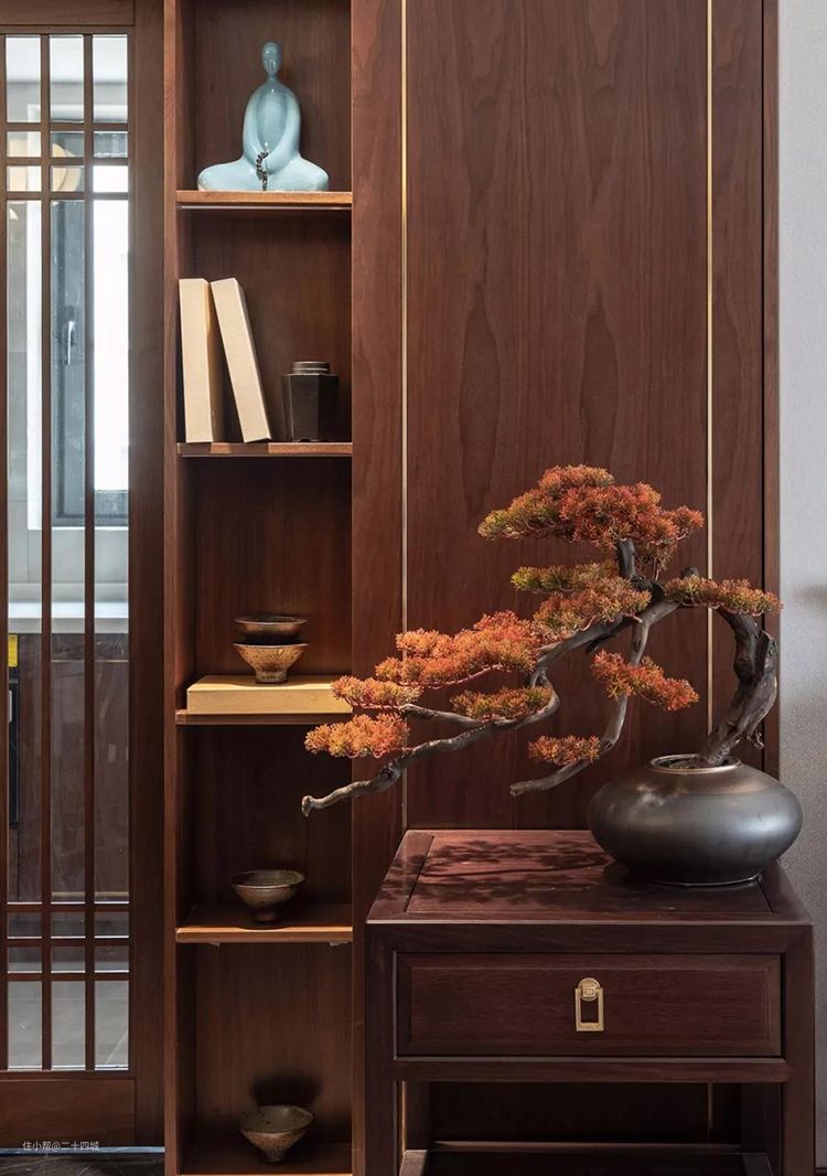 在细节上,实木矮几搭配上“迎客松”的装饰物,丰富了整个空间的立面,真正展示出一步一景的家居概念