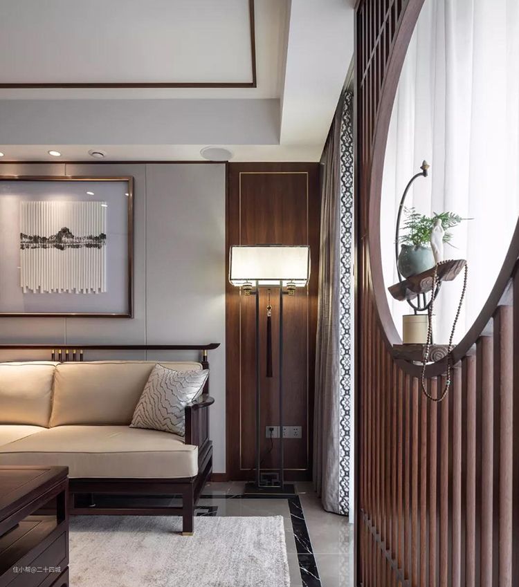 沙发旁边的落地灯结合了现代流行元素又结合了中式传统的古典雅韵,简约、宁清、素雅、清秀都能在风格中得到完美的诠释