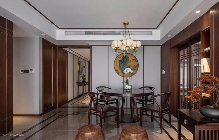 客厅望向餐厅视角,简洁大气的中式家具体现出别样的魅力,大量实木的运用又能真切感受到自然与人文、传统与现代的完美共融,尽显东方美学