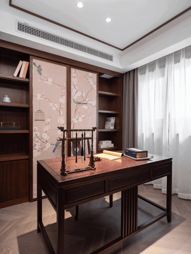 书房设计,胡桃的书桌尽显质朴、沉稳,用手轻触就能感受到木材的温润质感;同时空间内无需雕龙刻凤,一把圈椅、两盏清茶,寥寥几笔便能勾勒出韵味