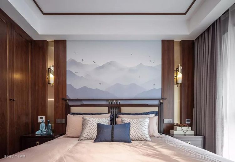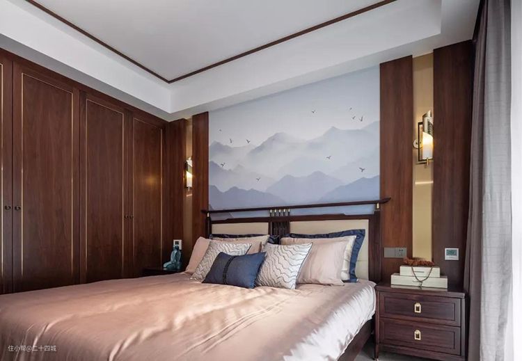 主卧淡粉色的棉麻床单被阳光晒出淡淡洗衣粉的味道,搭配上到顶的实木衣柜以及水墨的桩头背景墙,很容易给人家的安心感