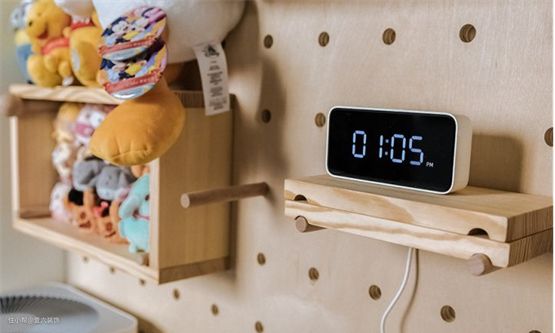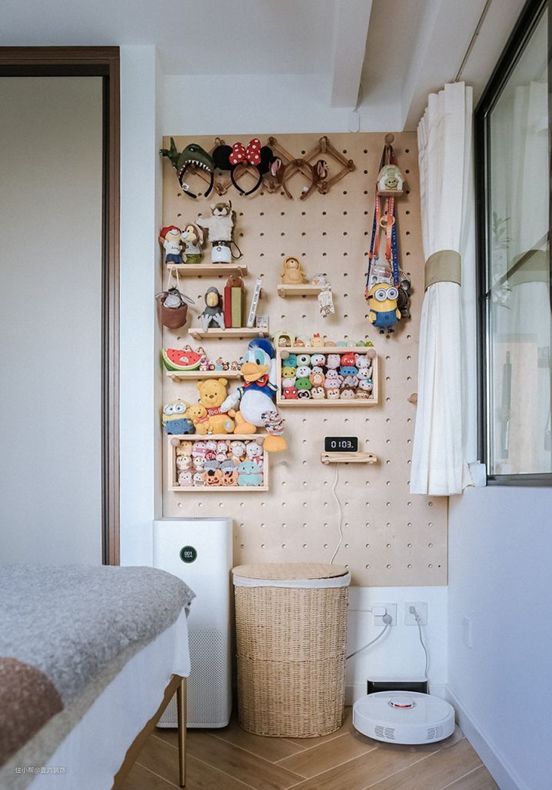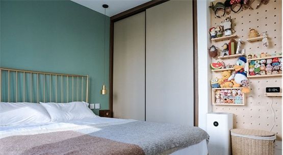 床头另一侧是定制衣柜和洞洞板墙,都做了“内嵌”设计。业主可以把喜爱的毛绒玩具和手办收纳在洞洞板上,节省空间,也有很好的陈列视觉效果!