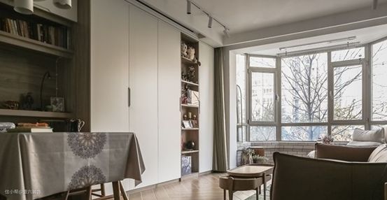 第三是做干湿分离的时候,洗手台的后面有了一面凹墙,它正好可以用来做卧室衣柜的空间,这样卧室里不会有突兀的柜体,衣柜可以完全“嵌入”,让小户型拥有畅通无阻的动线。