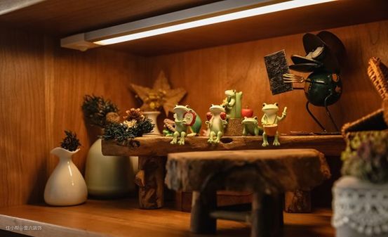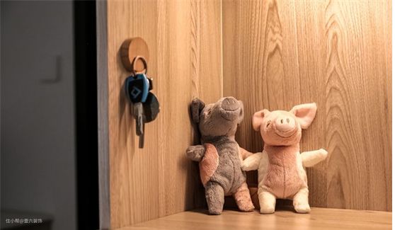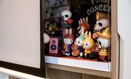 如果整面墙都是柜子,会容易在视觉上造成压抑,为了避免这种情况,我设计了开放格,作为手办和毛绒玩具的陈列展示区,既满足了业主收藏需求,也让客厅多了暖暖的生活气息。