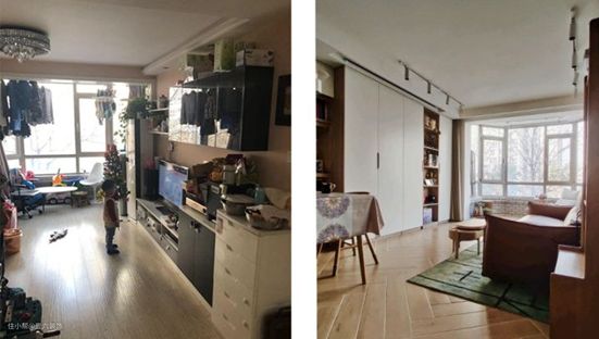 2.户型面积小隔墙却很多,视觉压抑,功能分区比较乱。业主希望整体空间能看上去更敞亮,同时提升收纳。他们的共同的爱好是收集手办、毛绒玩具,一直想有专门的地方来收纳和展示,而之前的生活环境无法实现。