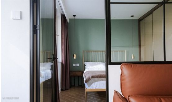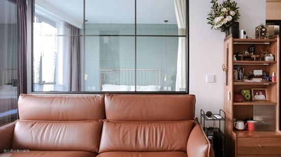 第二是打通和客厅的隔墙,用黑框玻璃这种更有通透感的材质替代传统后墙,使视线更加明亮,拉上窗帘之后立即又有了私密性。