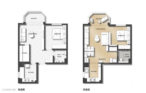 第一是门的位置做了改变,原来它在卫生间旁边,还对着入户门,现在把它调整到客厅阳台旁边,和其他“动区”分开,让业主能能获得一个更安静的休息环境。