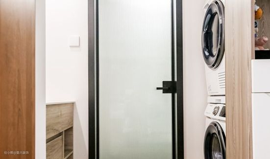 首先给它做了干湿分离,盥洗区在卫生间外,对面是洗衣机和烘干机;而马桶区和淋浴区用黑框钢化玻璃做隔断。