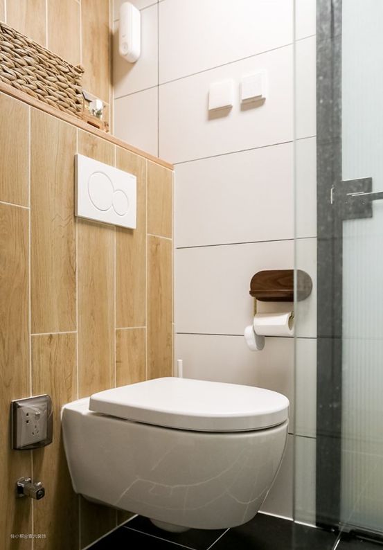 马桶改成壁挂式马桶,没有卫生间死角、方便清理,上方也留出了可以收纳生活用品的地方。