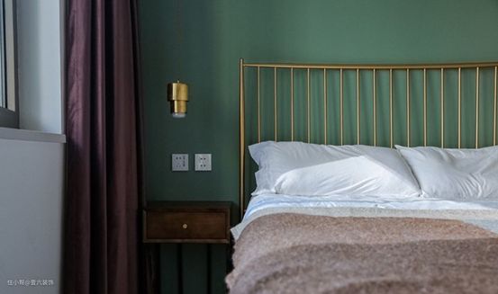 很喜欢卧室的配色,灰绿色背景墙+金属床头和吊灯+紫色丝绒窗帘,让它有种复古的优雅感。