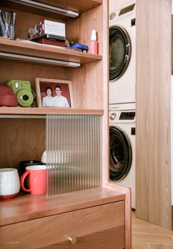 以前洗衣机是放在厨房里的,现在移出去,和烘干机一起放在别处(洗手台对面),让厨房的功能更简单化。