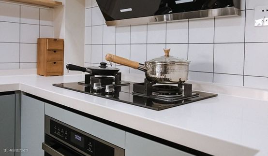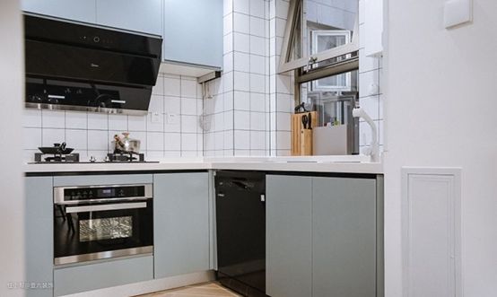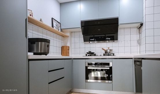 厨房的颜色搭配,灰绿色橱柜+白色方砖+木纹地砖,让小户型厨房显得舒适温暖,而且经久耐看。