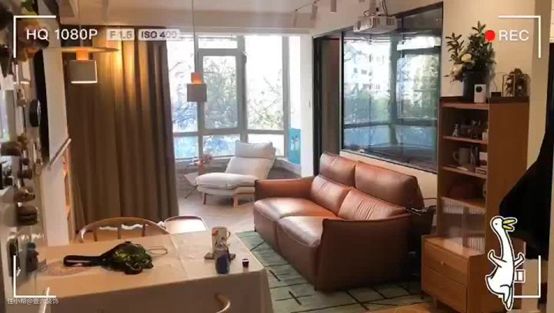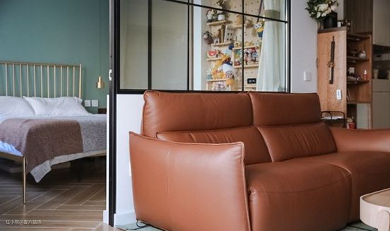 暖棕色皮沙发是一个来自意大利的品牌,NATUZZI。它是一款电动沙发,坐在上面可以根据不同生活情景,轻松地调整位置,惬意阅读位、躺平休息位…...沙发对于两位业主来说使用频率非常高,算整个家中的核心区,因此也给了它较高的预算(它是家里最贵的家具喔)~