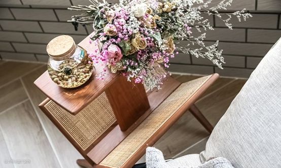 沙发旁边是一个樱桃木的边柜,有收纳和展示两个作用。放水杯的这一层,用长虹玻璃做了推拉门,半透光的朦胧美感,不仅在视觉上讨人喜欢,也有遮挡凌乱、保护隐私的效果。