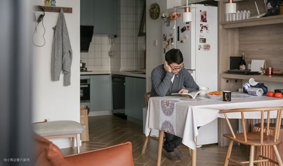 原来的客厅有一个类似榻榻米的暗房, 改造之后被移除,墙体打通后开放出来的空间,变成了现在的用餐区,除了吃饭之外,业主也可以在这里办公。