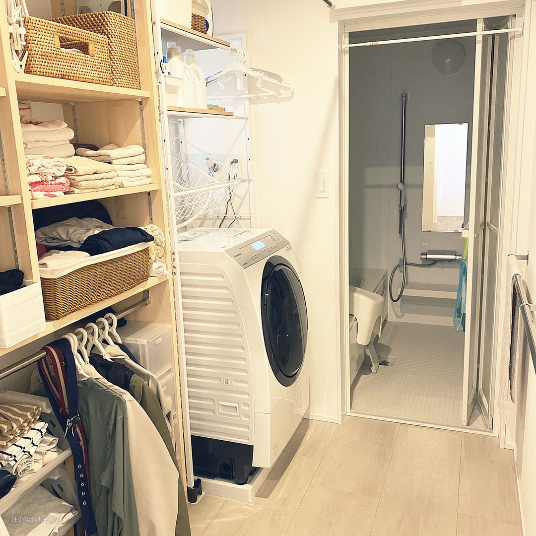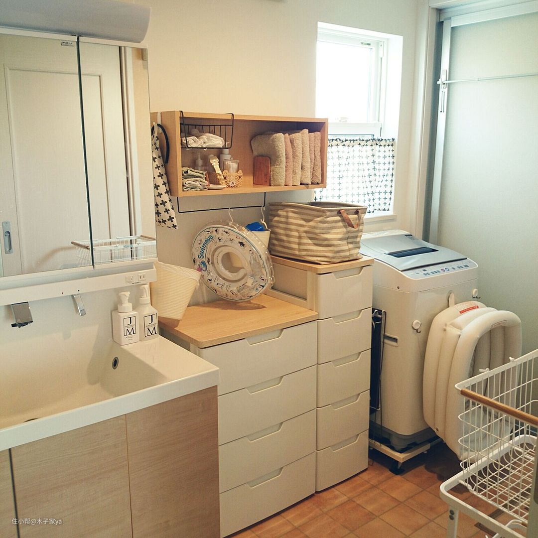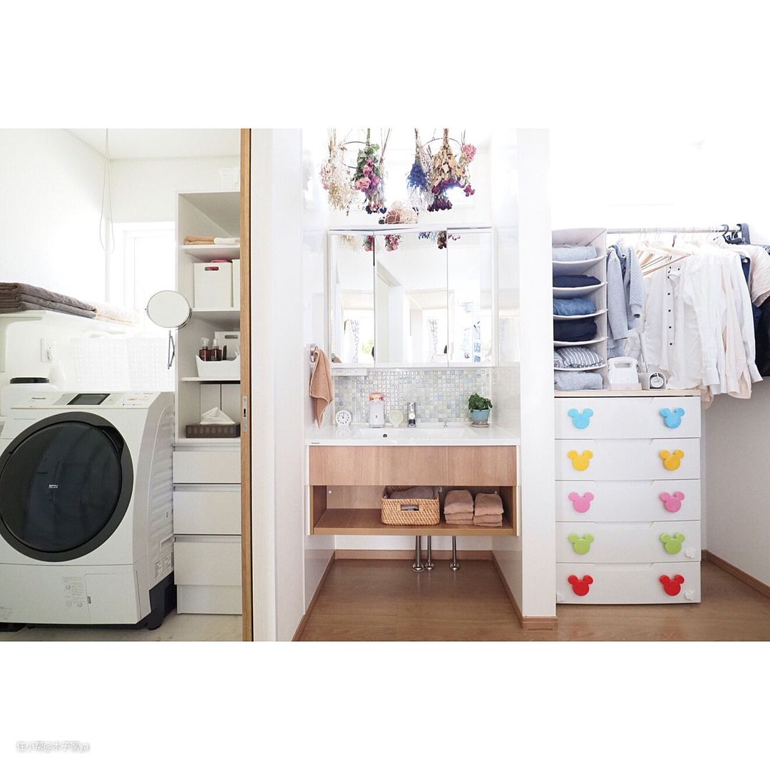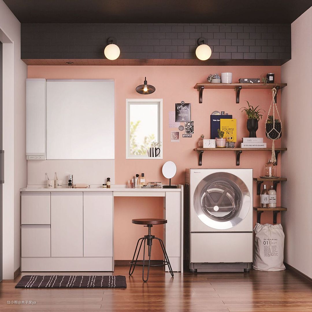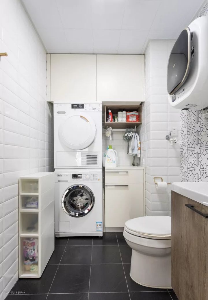 这种设计方案在日本家庭中非常常见,他们喜欢设计三分离卫生间,其中浴室柜和家政间共用,洗完澡直接把换洗衣服放到洗衣机,也可以在浴室柜手洗衣服,直接烘干晾晒折叠,基本上家务都在这个空间完成。