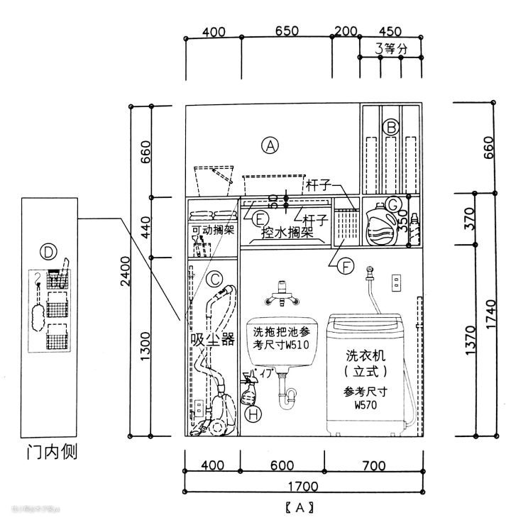 2、家政柜+洗衣机+洗衣池+晾衣区+熨烫衣区
