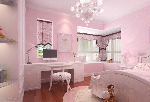 这款女孩卧室,采用木地板加上粉色的墙纸进行搭配,卧室中设计非常简约温馨,床品和窗帘拼配起来,舒适的沙发上摆放在哪里显得格外的温馨、舒适。