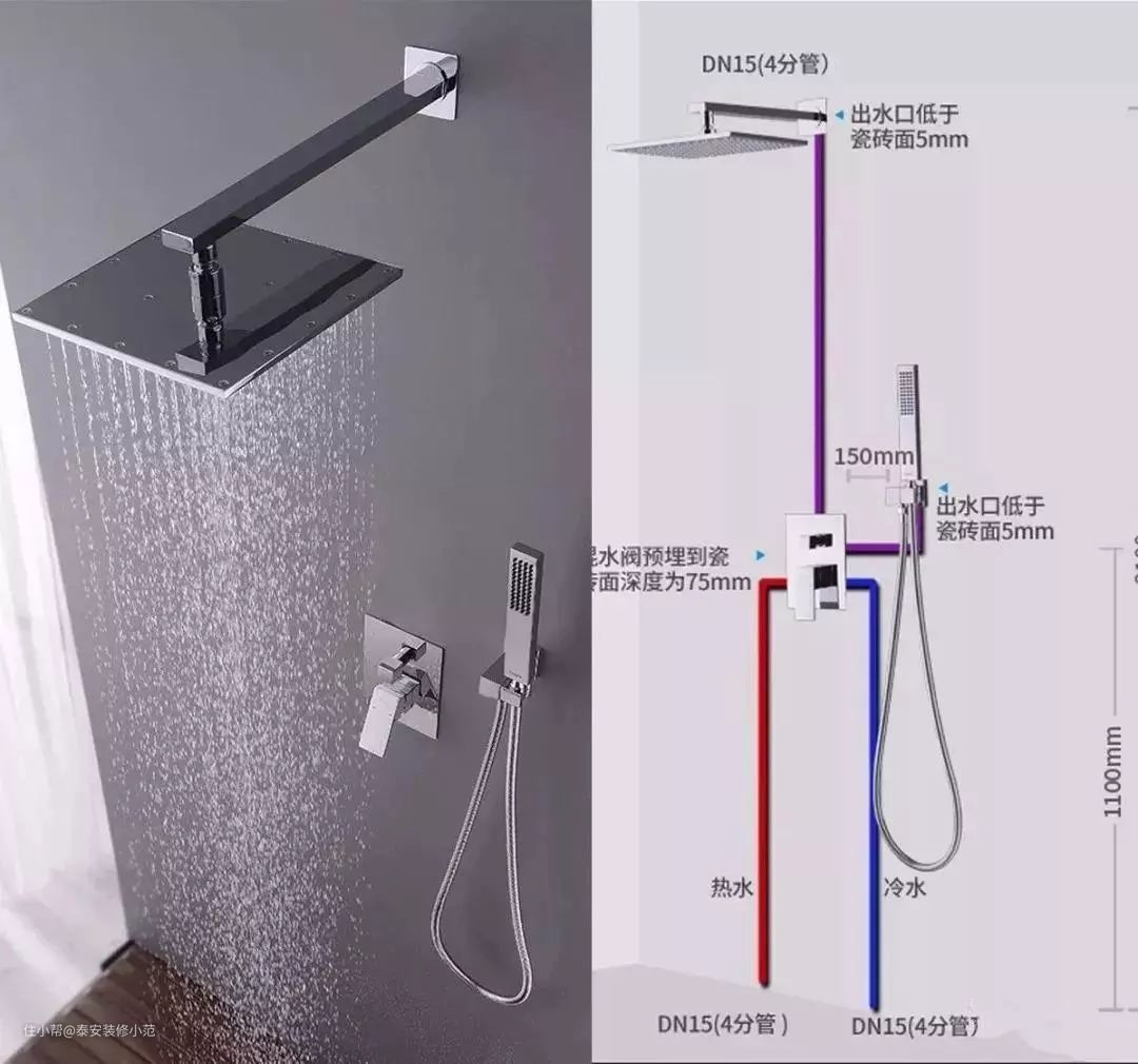 暗装花洒也是入墙式,进水管、混水阀都埋入墙里,只露出开关和出水口,虽然施工复杂,但颜值超高。
