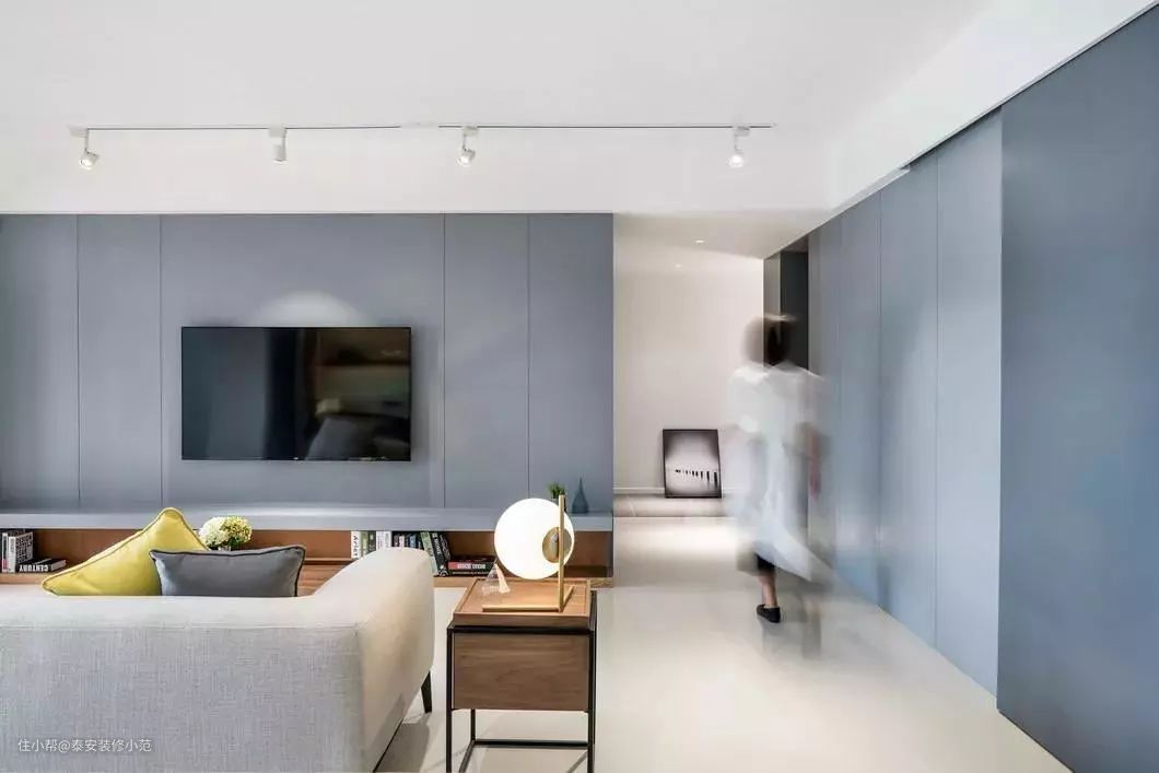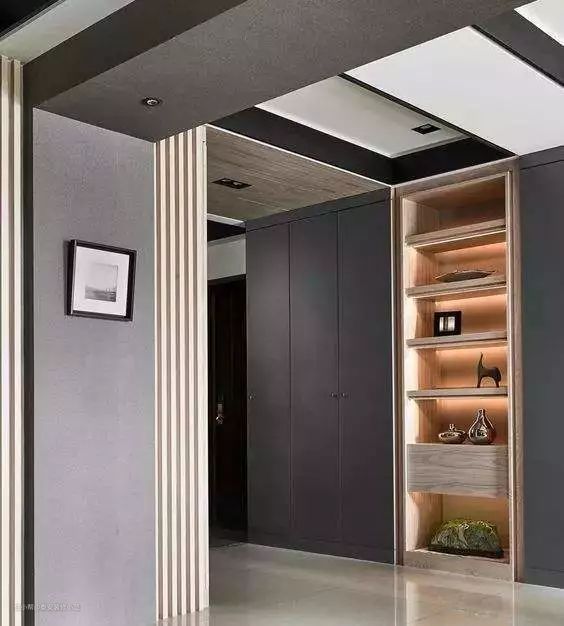 不装把手是柜子隐形的关键。衣柜嵌入进墙体中,甚至直接当成墙体,吊顶做成封闭式,和衣柜顶面相接,让衣柜和墙面成为一个整体。