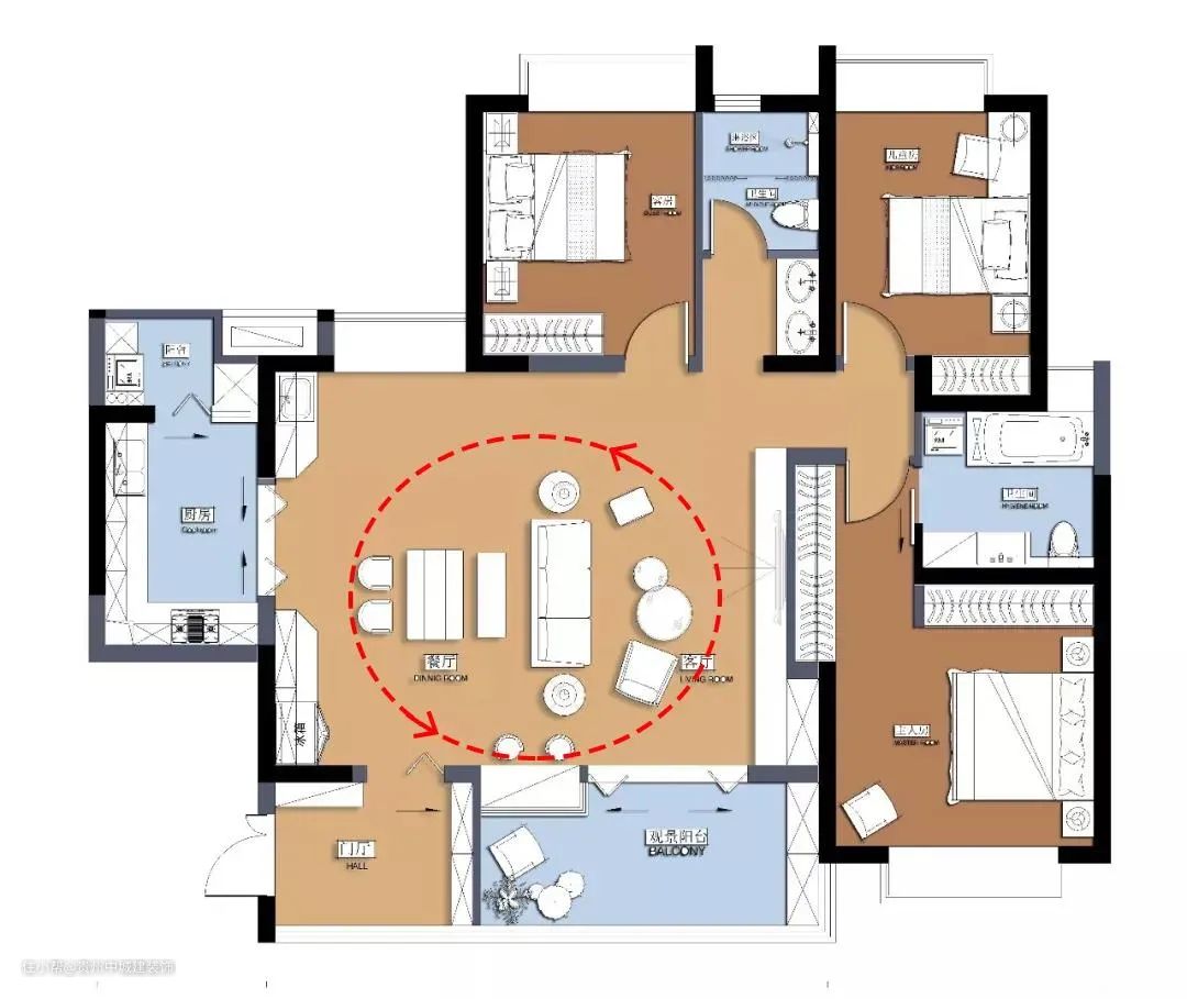 沙发不靠墙,可以打造出灵活的“回”形动线: