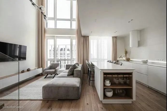 两个空间一体是能让空间显大的方式,但如果没有隔断的话,又有点凌乱,单独做个隔断又有点分离和死板。