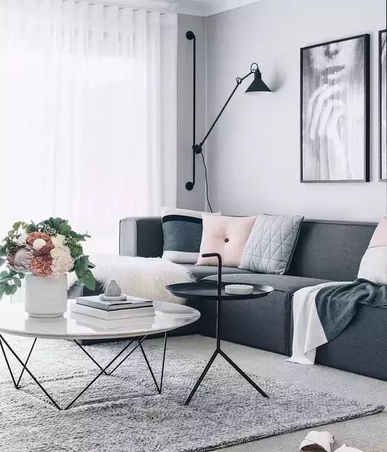 整体灰色度的客厅,白色的茶几搭配白色窗帘,明暗协调,舒适温馨。