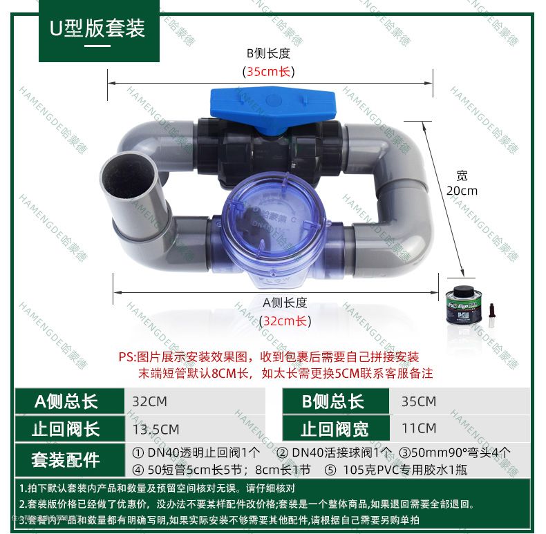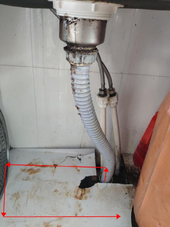 3.把拼接好的止回阀拿去下水管处比对,看下安装空间,(U型版的尺寸是35*20*32)配件可以根据安装环境灵活变通,在确认无误就可以涂胶水安装止回阀了。 注:安装好的套装如果和地面有一段距离要找个东西在下面垫着做支撑,更稳定一些