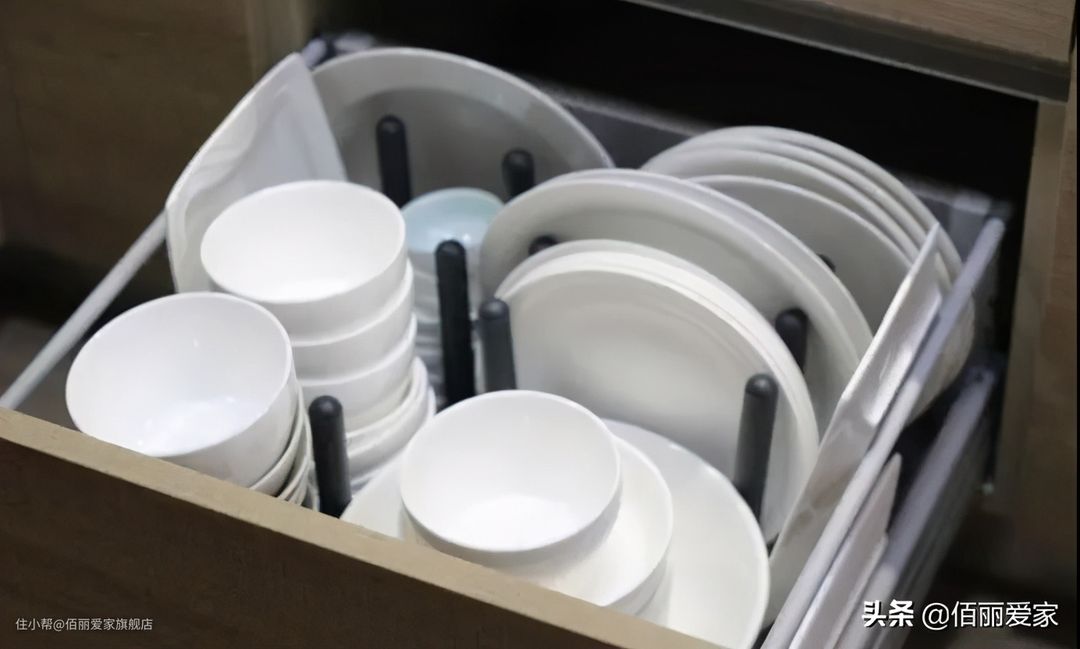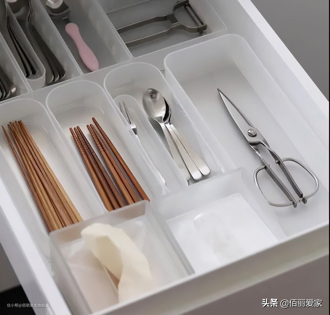 厨房里的餐具也是种类杂多的,用分隔收纳盒收纳餐具,选择合适的大小抽屉,摆放餐具就一目了然。