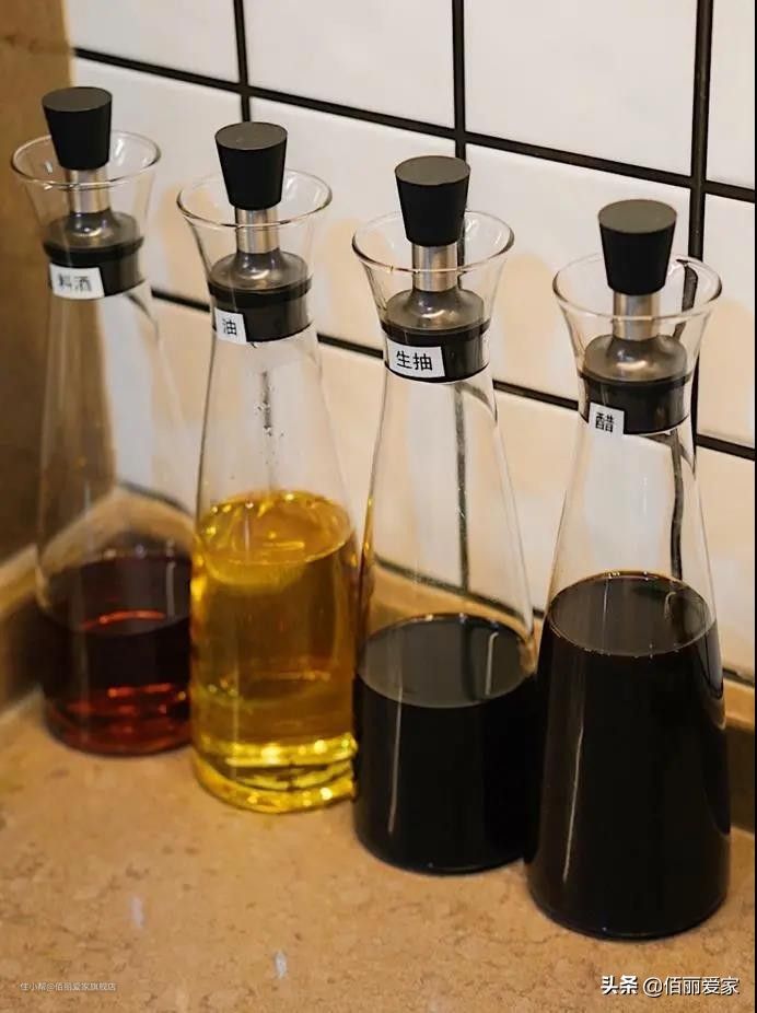油醋瓶需要放在橱柜外面以方便人使用,换分装瓶配合标签机,打印出标签和日期,更方便拿取,看着也治愈,厨房看起来也更整洁。大开口油醋瓶可在细嘴和敞口瓶之间,自如切换,当需要油炸时,拔出塞子,咕咚咕咚的往下倒油,非常顺畅。