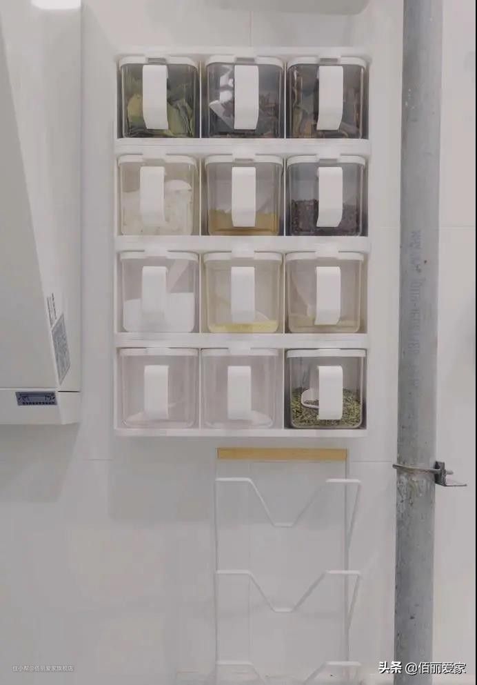 主妇们很清楚,为了做出美味的食物,会买很多调味料,五花八门的调味料都堆在一起非常不美观还占用空间。如果台面空间已经不够用,何不试试将调味品统一收纳上墙呢?