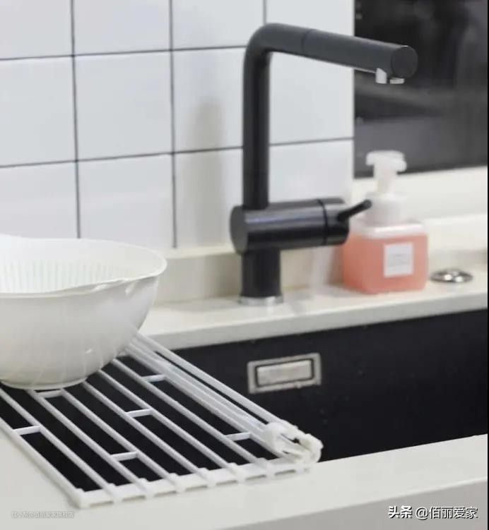 很多家庭的厨房面积太小,台面上可能连一块砧板都放不下,那么我们可以给水槽区备一个卷帘沥水架,具有多重功能。首先它能当砧板使用,展开放在水槽上,就可以在上面摆放砧板了,解决了砧板占空间的问题。其次,它还可以充当沥水的功能,洗完的碗碟放这里沥水很方便,还有蔬菜水果也可以放这里沥水。