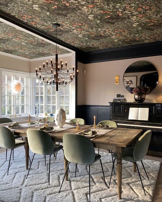 这个天花板被漆成了华丽的翠绿色。墙壁的顶部被漆成近似颜色,以配合天花板,墙壁底部有白色护墙板,它创造了一个优雅的空间。