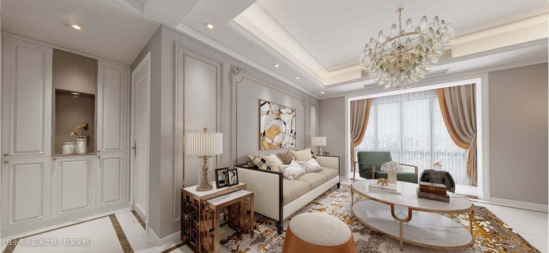曲线设计的法式轻奢家居,彰显艺术之美。法式轻奢造型设计中添加曲线,也是法式风格的特有元素,其中有几何图形的搭配,比如方正矩形、框架架构等,几何线条设计的刚中有柔,比如沙发、茶水、案几、电视柜等,呈现几何图形的框架结构,灯饰多数为圆形。