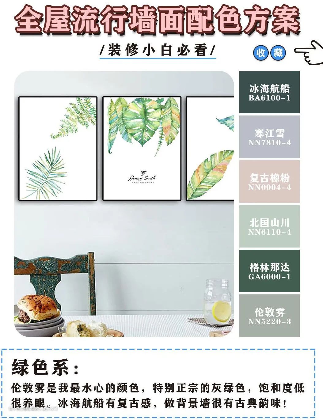 ◼️绿色系:北国山川营造出清新自然的田园风格;伦敦雾搭配浅色系的家居超温柔的,冰海航船是充满浪漫的复古色