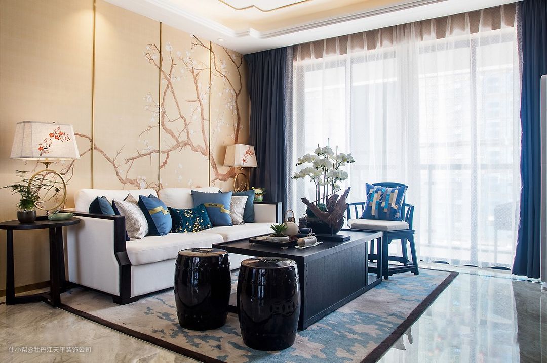 这个客厅的沙发背景墙主要以梅花为主,那么可以选择一些带有花系的抱枕会有过度的感觉,非常不错。