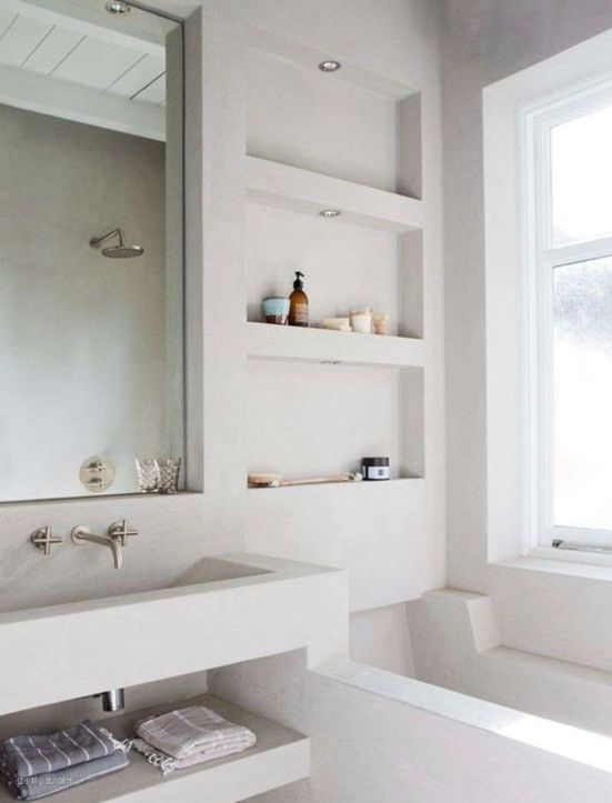 卫生间里的洗漱柜、收纳柜和壁龛,用板材不防潮瓷砖太冰冷,不如试试微水泥: