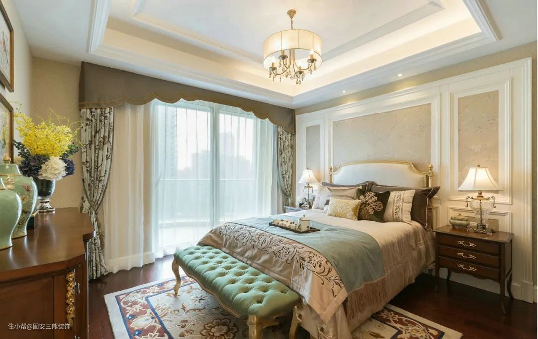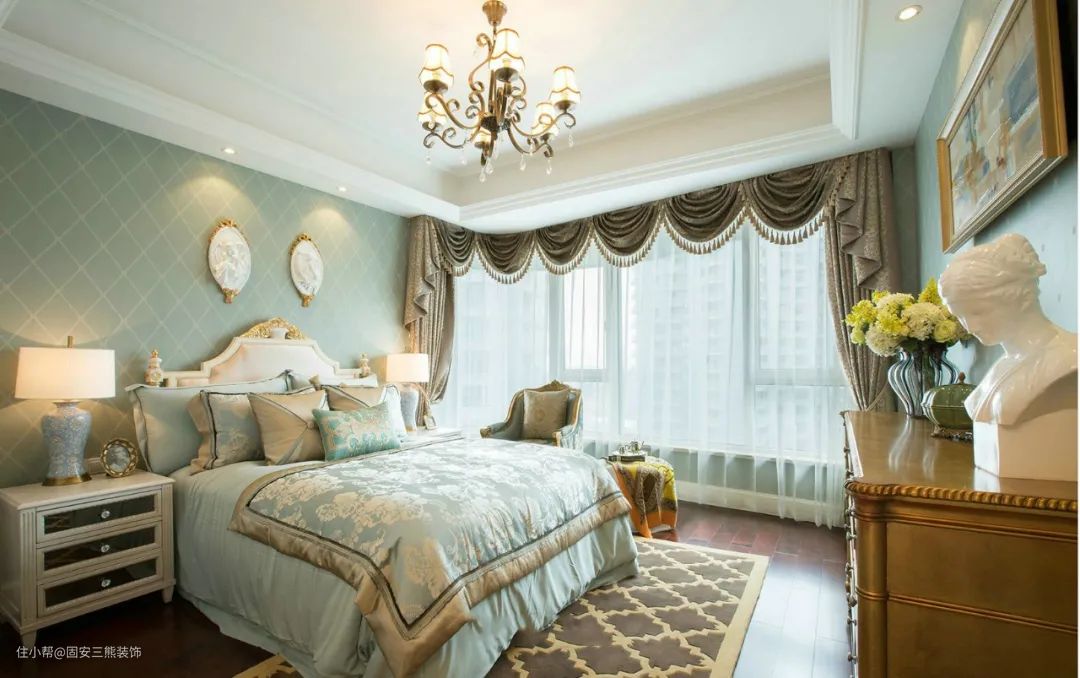 卧室意在营造具有新古典法式宫廷风,空间以简约的造型和丰富精致的细节强调精神所在,以此营造融入现代而又能展现华丽、尊贵的法式宫廷氛围。