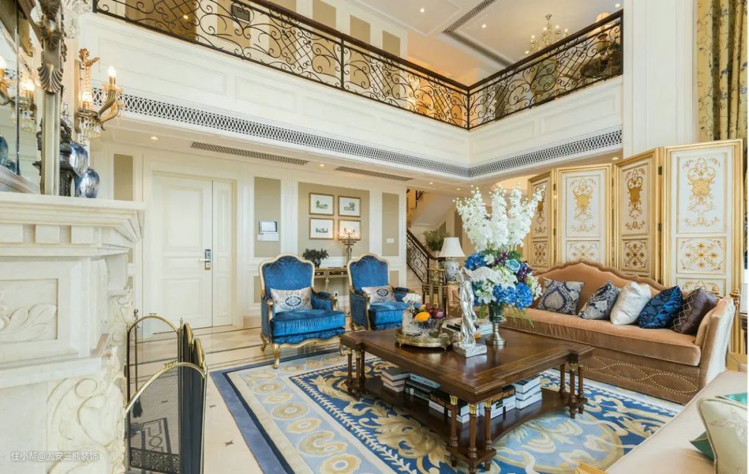 整个客厅以经典优雅的法式风格为主,主色调以浅色系为主,搭配经典的宝石蓝、咖啡棕,6.3米的挑高空间在展示时显得大气庄重。