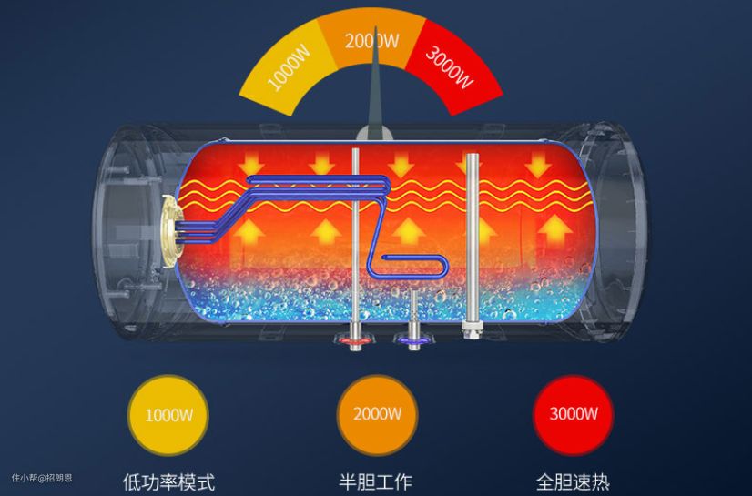 双管加热更多应用在高端电热水器中,有两根加热管,上下分布在水箱里,可以实现半胆/全胆加热,加热功率能够改变(变频技术),加热效率更高,速度更快,使用寿命也更长。
