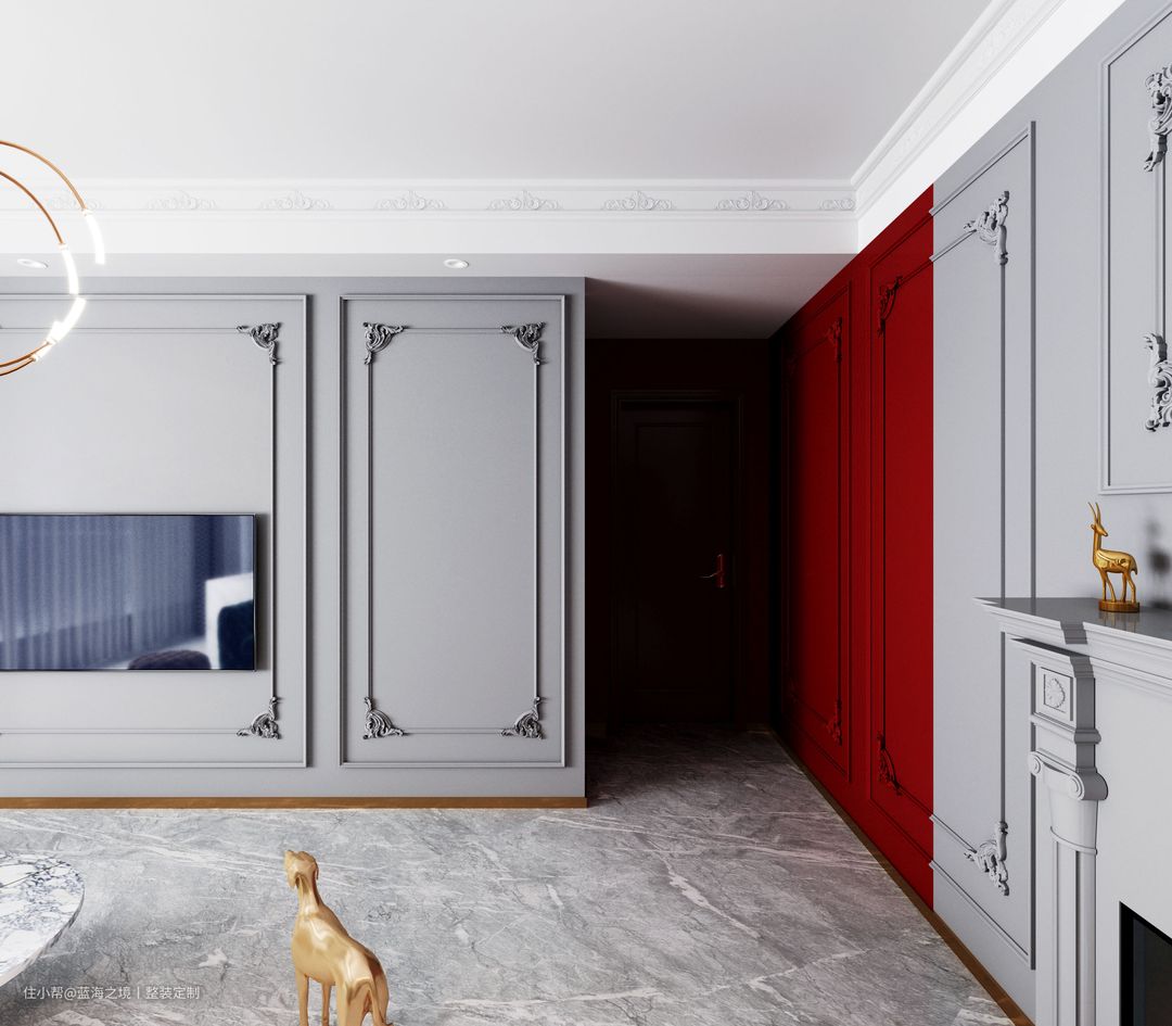 轻奢式整木,在色彩搭配,家具组合之外,空间格局也有所调整,例如,将原本封闭的书房改成开放式,书桌与书架以一个完整的亚灰色立面来展现,保留了功能性的同时,让整个客厅更加宽敞明亮,带来更好的视觉感受。