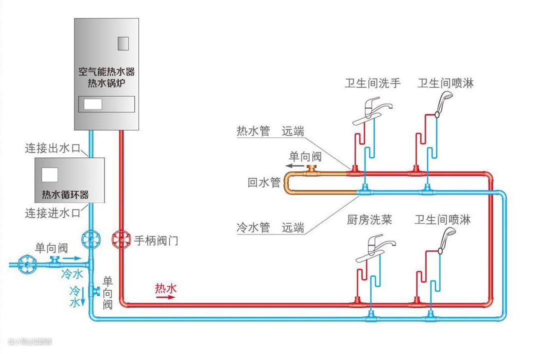 小循环,各个用水点不需要用热水管支路连接起来,只要很简单布置一根热水管就行,然后在用水点最远端连接回水管,让热水重新回流到热水器里加热,如下图: